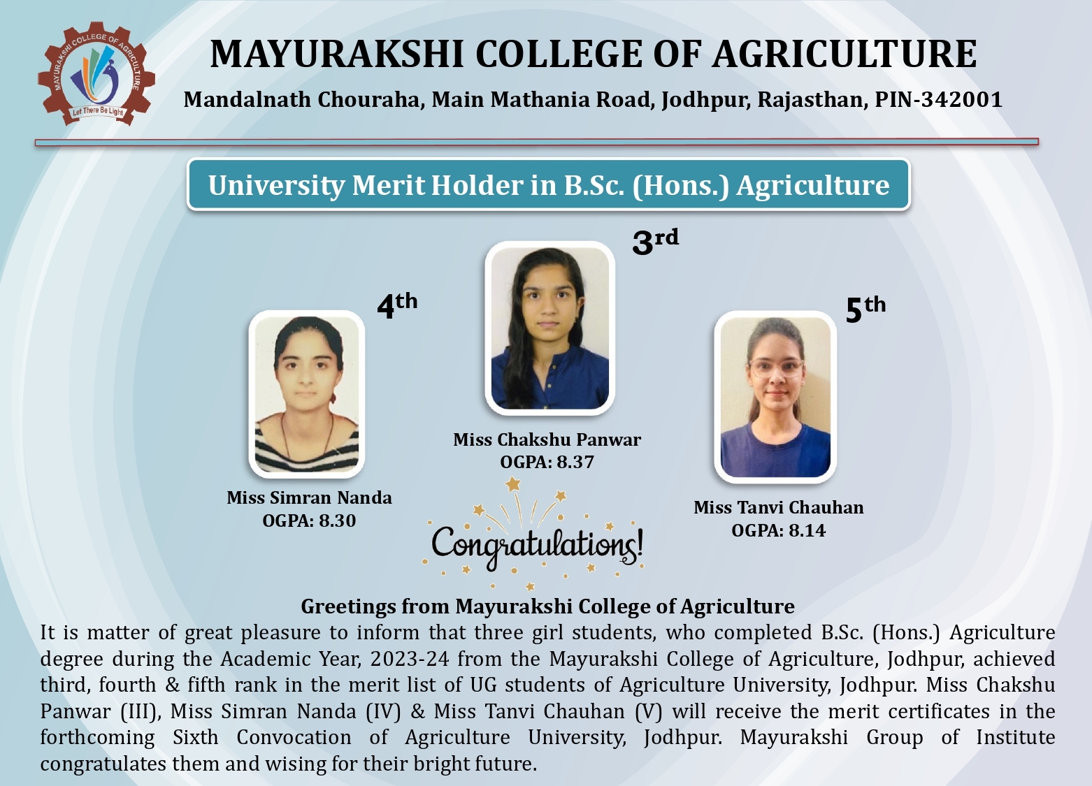 First passed out batch of BSc (Hons. ) Agriculture, MCOA, Jodhpur, AY, 2023-24 students in 6th Convocation of Agriculture university, Jodhpur on 15.2.25